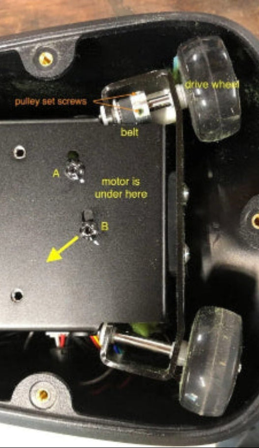 - Rear wheel drive belt is slipping. The powered rear wheel is belt-driven with a stepper motor. It is possible that the belt lacks sufficient tension. You can hear this on the court if you are next to the machine (it will make a clunk clunk clunk sound) but you can investigate at home using the app in “manual mode” . Use the arrows to drive the machine left and right. Put a little pressure on the machine to simulate a load of balls. At some pressure level you should hear the belt drive skipping steps, but if you can stop it very easily it may need adjustment. To fix it, do the following steps:Flip the machine upside-down and remove all 9 screws to take off bottom cover. Use the 3mm hex key we provided, or one you might have in a bicycle repair kit.Try turning the drive wheel by hand to get a feel for the torque at which the belt will slip in both directions.Loosen screws A and B in the picture below with the 3mm hex key. Loop a piece of thread under screw B and pull in the direction shown, with about 2-3 lbs of force. While still pulling on screw B, tighten screw A. Recheck the torque at which it will slip - hopefully you made it better! Here’s a video version of the repair:
